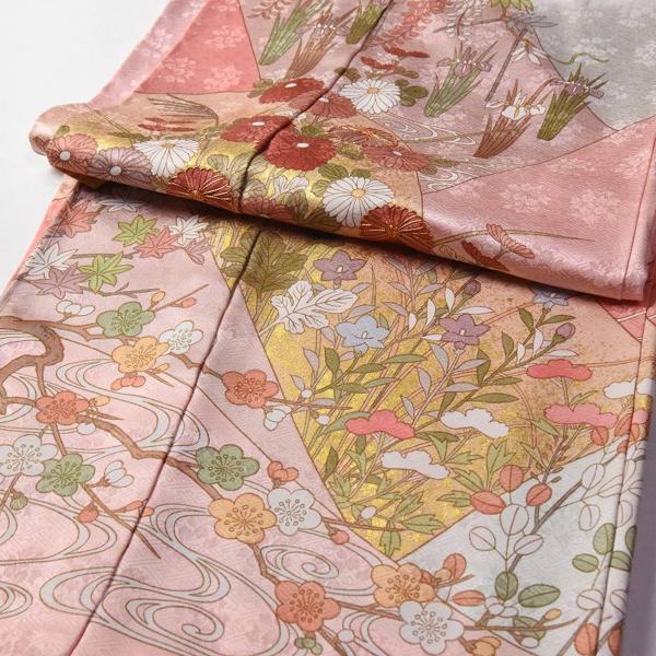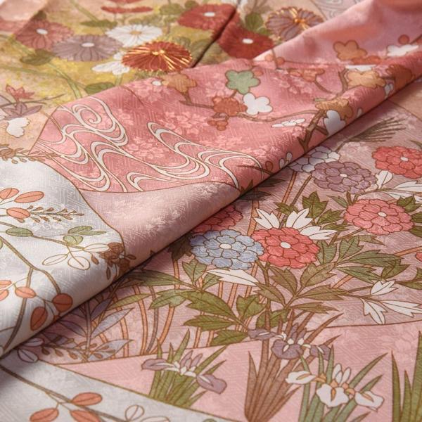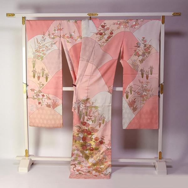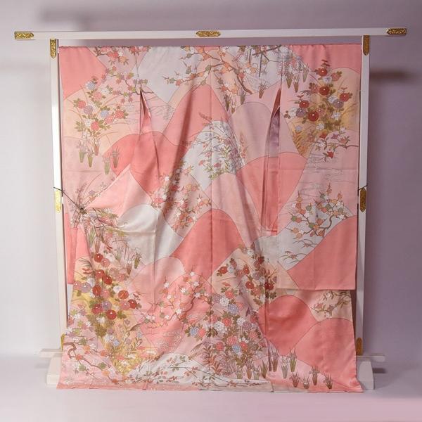 振袖 藤井寛 手縫いお仕立て付き 皇室献上作家藤井寛氏作 振り付き御振袖(本振袖)珊瑚系色(ピンク) 山取りに花々模様 身長170cm弱まで、裄72