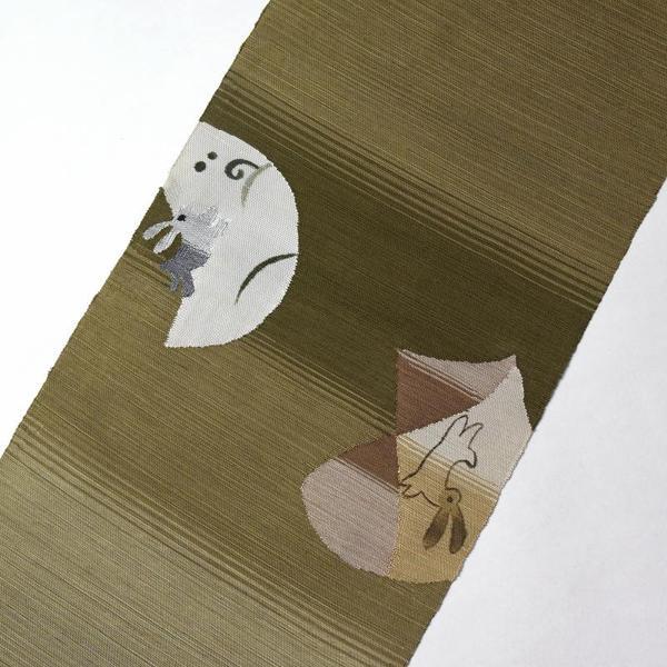 八寸帯 お仕立て付き 手織紬 柿しぶ染 八寸名古屋帯(お太鼓柄)紬地 うさぎ 鶯色 かがり帯 送料込み