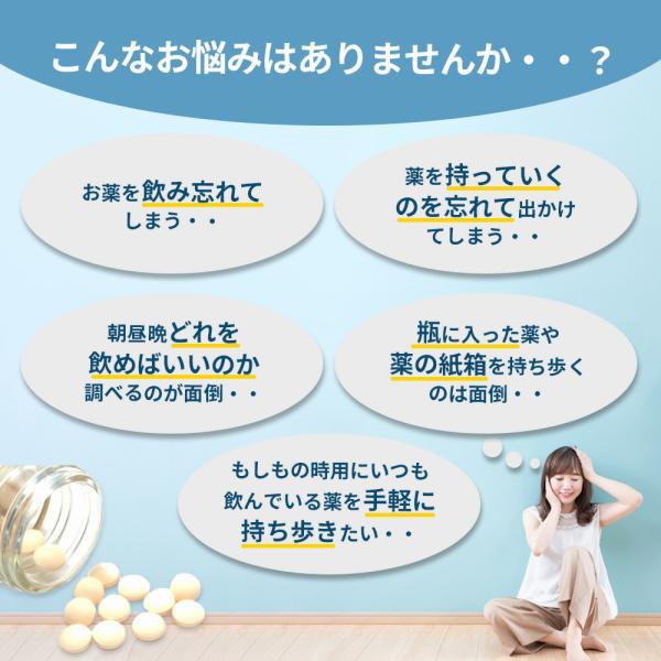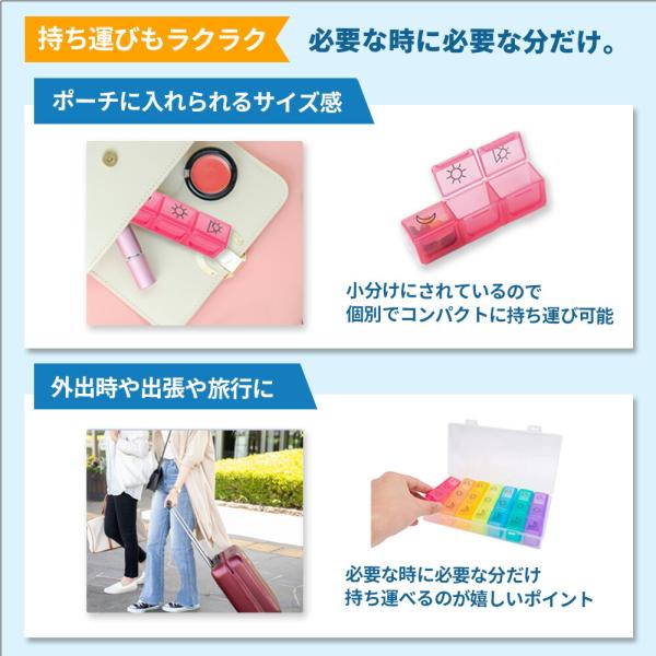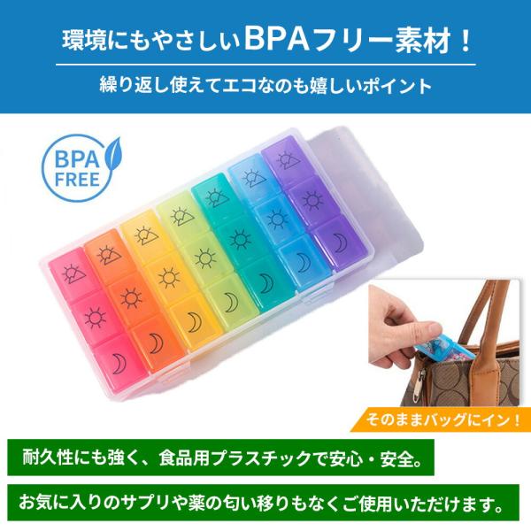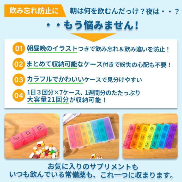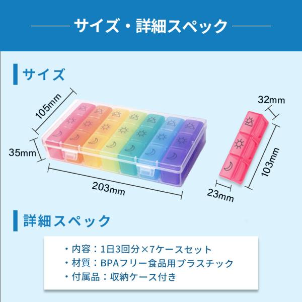 旅行や外出時にも! ピルケース! 1日3回 1週間分! 飲み忘れ防止!飲み忘れ防止に! 朝は何を飲むんだっけ? 夜は・・・? もう悩みません! 朝昼晩のイラストつきで飲み忘れ&飲み違いを防止! まとめて収納可能なケースつきで紛失の心配も不要! 1日3回分x7ケース、1週間分のたっぷり大容量21回分が収納可能! カラフルで可愛いケースで見分けやすい! いつも飲んでいる常備薬もこれ一つに収まります!持ち運びもラクラク! 必要な時に必要な分だけ! 小分けされているので個別でコンパクトに持ち運び可能! ポーチに入れられるサイズ感! 外出時や旅行や出張・・・必要な時に必要な分だけ持ち運べるのが嬉しいポイント!環境にも優しいBPAフリー素材! 繰り返し使えてエコなのも嬉しいポイント! 耐久性にも強く、食品用プラスチックで安心・安全! 薬の匂い移りもなくご使用いただけます! そのままバッグにイン!BPAフリー食品用プラスチック! 収納ケース付き! 収納ケース 約105mm x 203mm x 35mm 小分けケース 約103mm x 28mm x 32mm