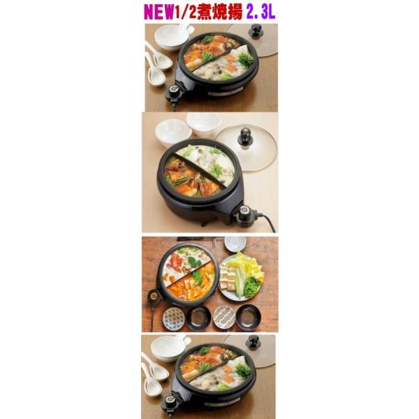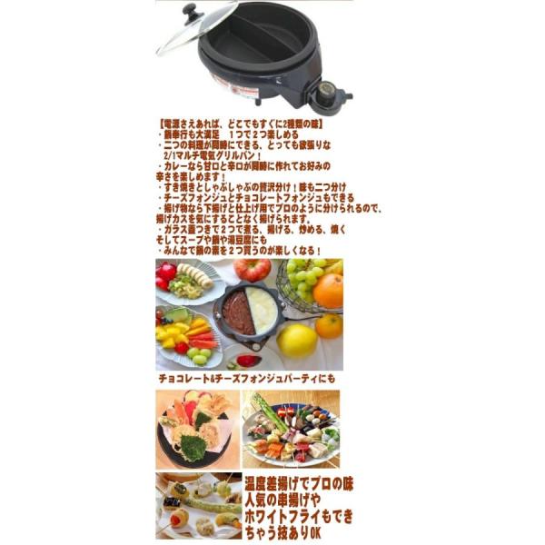 ・鍋奉行も大満足 1つで2つ楽しめる・二つの料理が同時にできる、とっても欲張りな電気グリルパン!・カレーなら甘口と辛口が同時に作れてお好みの辛さを楽しめます!・すき焼きとしゃぶしゃぶの贅沢分け!味も二つ分け・チーズフォンデュとチョコレートフォンデュもできる・揚げ物なら下揚げと仕上げ用でプロのように分けられるので、揚げカスを気にすることなく揚げられます。・ガラス蓋つきで2つで煮る、揚げる、炒める、焼くそしてスープや鍋や湯豆腐にも