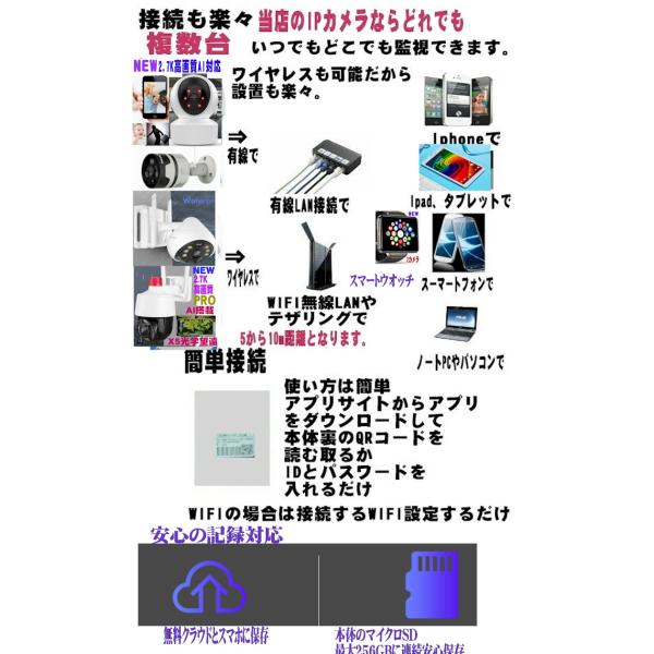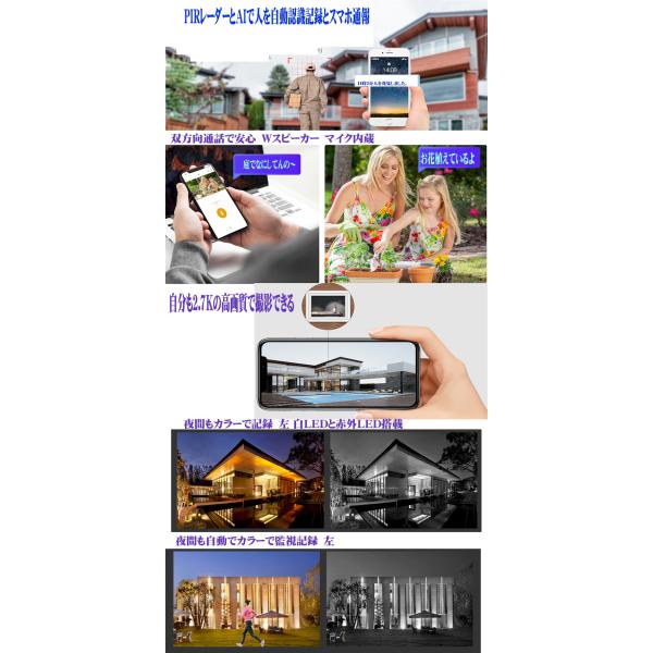 新デザイン意匠登録業界初ソーラーパネル付ハイパワー充電池内蔵3電源工事配線不要。高画質エリア対人レーダーAI設定検知アラームフルHDハイビジョン 高解像度高暗視距離像度 白色LEDと暗視遠赤外LED対応で夜間のカラー化、光警告音、双方向通話も可能で来客との通話可能。頑丈な形状な理想型小型1/2軽量600g 卵型のデザインでIP66の防塵防滴構造でどんな環境にも対応。本格的な防犯システムは高価ですしケーブル設置も大変でHDDの交換やバックアップも大変。いざと言う時にHDDレコーダー本体を破損されたり故障したりの話も多いです。それに一般のIPカメラだけでは監視はできても常に録画されないので証拠として記録が残っていないのが致命的。市販の最大256GBマイクロSDと無料クラウドで連続録画やスケジュール録画を本体に常に長時間記録され過去の録画を再生さらに、お手持ちのパソコンやスマホIphoneでいつでもどこでも遠隔操作して野外で監視録画。防犯だけではなく動物観察やカメラの前に温度や湿度計を置いてビニールハウスの野菜や果物などの発育観察、水温計で魚の管理、プールや工場、温泉の温度管理や監視などにも便利です。 ブラックフライデー