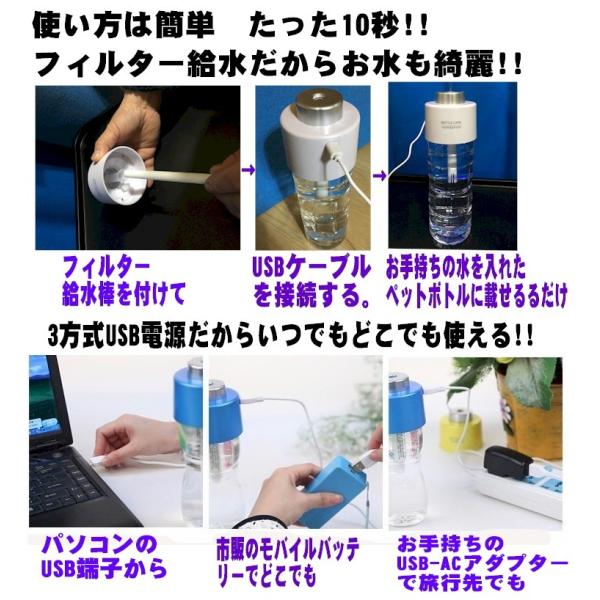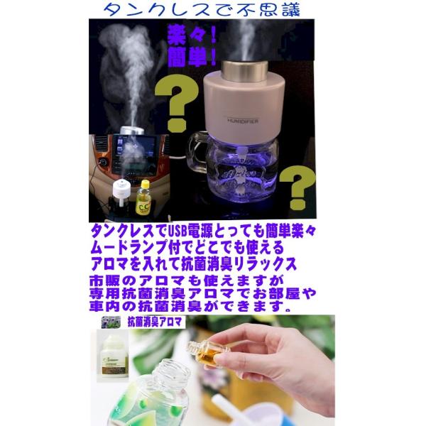 ミストアロマ加湿器 大容量可能 不思議なタンクレス加湿器 USB加湿器 抗菌消臭アロマ付 車載可能 ペットボトル加湿器 ブラックフライデー