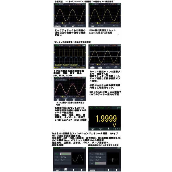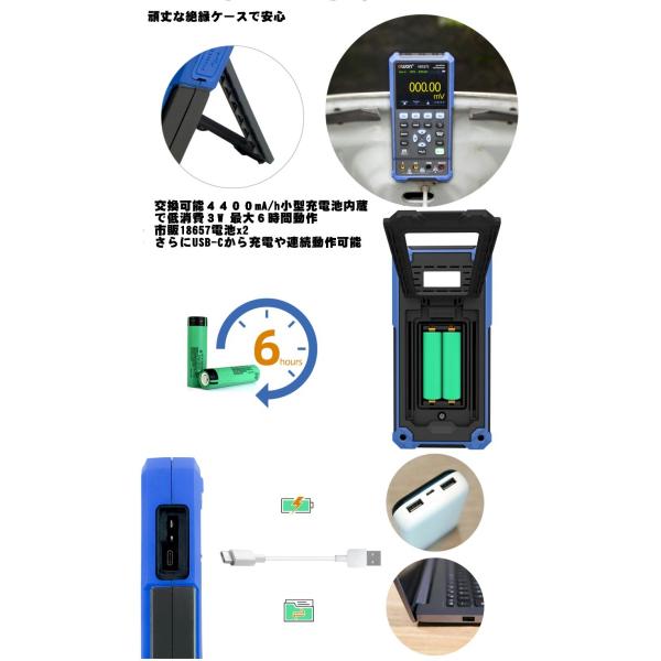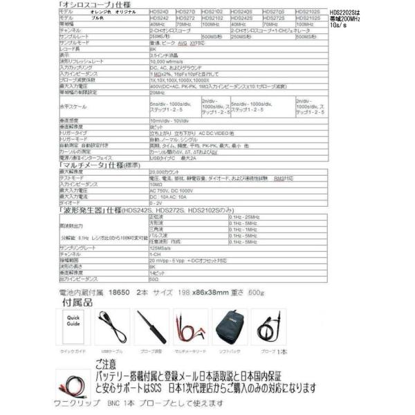 新製品HDS200シリーズHDS242 40MHz /HDS272 70MHz 250MSa/HDS1102 100Mz 500MSa/sサンプリングHDS242S HDS272S HDS2202 200MHz 末尾Sは任意波形発生器搭載 業界初多機能ハンドヘルド2CHオシロスコープ とDMM41/2桁 20000カウントマルチメータとDDS高精度任意波形発生器Sタイプハンディで3.5インチ大画面高視野角高解像度の多機能, 高コントラストカラーLCD搭載2チャンネル8BIT500s/sと8Kロング記録41/2桁 20000カウントマルチメータ 0.5% AC DC RMS電圧、電流、抵抗、静電容量、ダイオード導通試験DDS高精度任意波形発生器Sタイプ125MSa/s14BIT分解能 8Kの最大25MHz 0.1Hz分解能20mVから5Vpp 正弦波、方形波、パルス、スイープ任意同期可能16任意波形搭載片手で持てるハンドヘルド小型軽量で屋外使用も可能ジプロップなど防水袋で雨や雪の時もワンタッチ自動測定機能簡単機能切替市販18650リチウム電池内蔵,低消費電力3W, 約6時間動作簡単USB充電動作可能USBタイプCインターフェイス PCインタフェースと市販モバイルバッテリーやポータブル電源充電動作 サポートPCソフトウア接続 モビリテイー、修理、試験、研究開発、生産、データー収集、機器組込みなどに最適