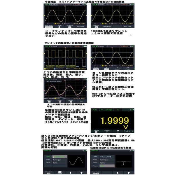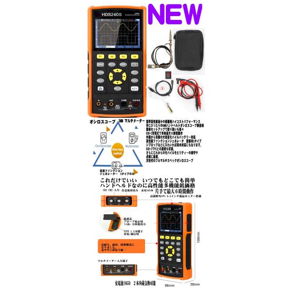 超特価セール 新製品HDS200シリーズHDS242 40MHz /HDS272 70MHz 250MSa/HDS1102 100Mz 500MSa/sサンプリングHDS242S HDS272S HDS2202 200MHz 末尾Sは任意波形発生器搭載 業界初多機能ハンドヘルド2CHオシロスコープ とDMM41/2桁 20000カウントマルチメータとDDS高精度任意波形発生器Sタイプハンディで3.5インチ大画面高視野角高解像度の多機能, 高コントラストカラーLCD搭載2チャンネル8BIT500s/sと8Kロング記録41/2桁 20000カウントマルチメータ 0.5% AC DC RMS電圧、電流、抵抗、静電容量、ダイオード導通試験DDS高精度任意波形発生器Sタイプ125MSa/s14BIT分解能 8Kの最大25MHz 0.1Hz分解能20mVから5Vpp 正弦波、方形波、パルス、スイープ任意同期可能16任意波形搭載片手で持てるハンドヘルド小型軽量で屋外使用も可能ジプロップなど防水袋で雨や雪の時もワンタッチ自動測定機能簡単機能切替市販18650リチウム電池内蔵,低消費電力3W, 約6時間動作簡単USB充電動作可能USBタイプCインターフェイス PCインタフェースと市販モバイルバッテリーやポータブル電源充電動作 サポートPCソフトウア接続 モビリテイー、修理、試験、研究開発、生産、データー収集、機器組込みOWONではありません