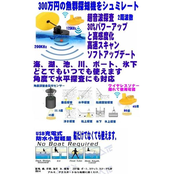 2in1 ワイヤレスソナー付4世代ポケット魚群探知機カラーアップデート新登場 落下も安心防水頑丈ケースセンサー30%パワーアップと高感度回路化帯域高速スキャンでの探索ソフトをパージョンアップ水深100m高感度調節付きで垂直〜水平探査も可能。フジテレビの番組でも紹介され東京湾で1時間の釣果がなんとアジ98匹!業務用にもどうぞ!!水深最長0.7〜100m、水温(気温)水底の形状状態や大中小魚群の4まで確認できます。最大探査水深100mリアルグラフィック表示で世界最小最軽量クラス!!防滴、広温度保障、防滴構造を採用し釣りを知り尽くした最新の水深計付きポケット魚群探知機(魚探)。魚群の位置、底の状態をリアルにグラフィック表示。魚群や水深を検知しアラーム発生。川、池、湖、海など釣り場を選ばずどこでも使用でき、岸壁、橋の下、ボート、小型船、カヌー、カヤック、川湖海の中や表面が凍った場所でもフロー式なのでOK!!グラスファイバー、ビニール、アルミ製ボートなら船の底に置くだけ!!魚の水深が測れさらに感度やズーム機能、水深選択も可能で探査できるので便利。(2021年11月リニューアル)