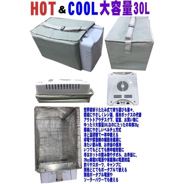 業界初1年中使用できるとっても便利な大容量の特許出願中の折りたためる当社オリジナル限定のたくさん入るポータブル30L冷温庫です。折りたたむと薄型18cm,2kgでベルトも付いているのでそのまま持ち運びも楽々です。冷凍食品や生鮮食料品、飲み物などお買い物にも便利、レジ袋や冷温ボックスの廃止でエコに便利。海や山でのレジャーやアウトドア、キャンプ、お買い物、釣り、お出かけ、運動会、スポーツ、帰郷時の車載用としても便利です。寝室、お子様部屋、リビングなどでも使用できちょっとしたクール冷温やホット保温としてもいかがでしょうか。別売のポータブル電源やソーラーパネルでどこでも使用できます