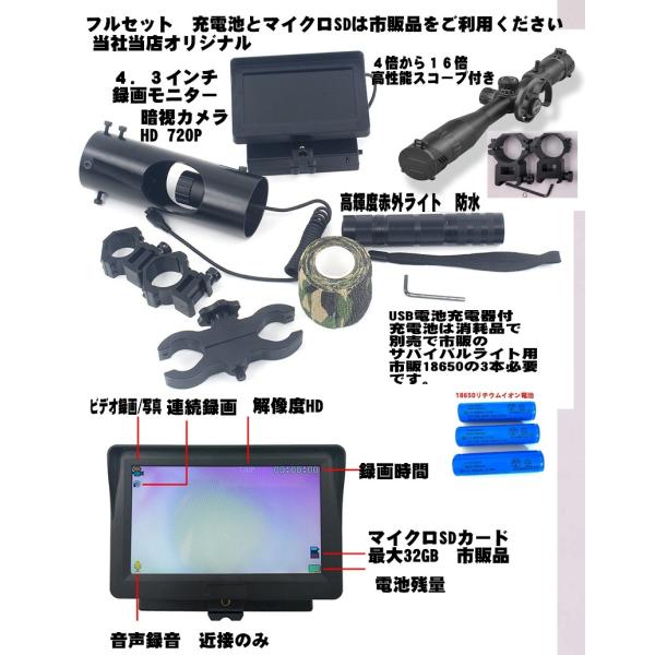 送料無料第4世代の業務用として新登場 業務用44mm16倍高性能ライフルスコープ付高画質ハイビジョンHD録画対応で400m対応となり暗視ナイトビジョンスコープビデオカメラが新登場!最大400m監視4.3インチカラーモニター搭載業務用特殊用高感度暗視センサー搭載で昼間も暗闇でもビデオや写真撮影が可能。高効率赤外発光部5W400mまでの暗闇を撮影光学4から16倍までの高感度望遠鏡としても使え少ない明りでも綺麗に撮影暗闇では赤外光で暗視撮影可能。暗視スコープ、ビデオカメラ、デジタルカメラ、望遠鏡として使用でき市販の充電池3本でUSB充電器付き。大震災の時や大雪の停電の時の救助に大変に役だったそうです。暗闇の中の救助やヘリコプターの着陸位置など自治体でも最近は準備しています。夜間の防犯や監視、魚、動物や野鳥、虫などの調査などとっても役立ちます。アウトドアや登山などの望遠撮影や緊急時にも役立ち。望遠、暗視スコープ、ビデオカメラ、デジタルカメラ機能の多機能で普通の暗視スコープと違い昼間や少しの明かりでも明るく撮影ができ一台あるととっても便利。通常は20万円ぐらいです。防水赤外ライト付き 人気ランキング おすすめ