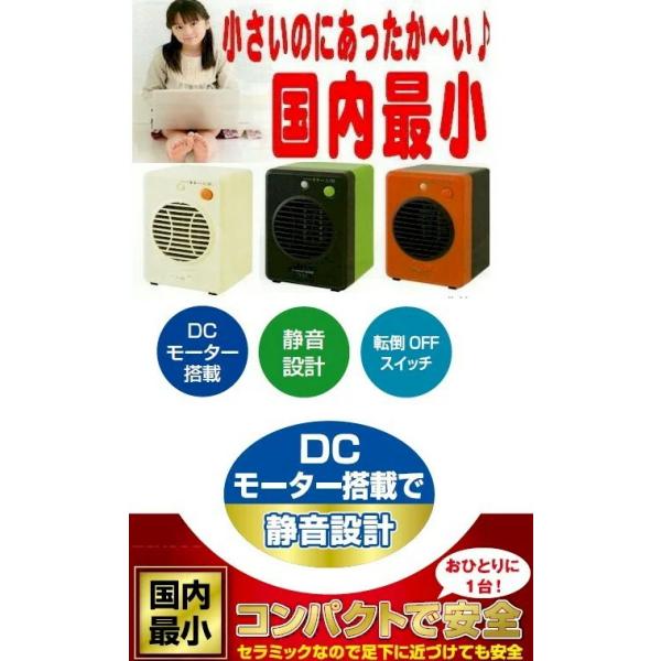 国内最小手の平サイズどこでもセラミックファンヒーター超小型軽量で省エネDCモーター使用で静かで必要な場所に移動設置できる簡単スポット温風暖房超小型軽量で省エネDCモーター使用で静かで狭い場所に置けて便利です。セラミックファンヒーターなので近づいても安心です。さらに最大1時間9.3円と省エネで経済的小形ミニなのでとっても便利な安心安全なミニコンパクトな速暖温風ヒーターです 二酸化炭素やガスを出さなず火を使わないので密閉したお部屋や狭いお部屋やトイレでもとっても安心安全です。ディスクサイドやテーブル下などにもとっても便利です。トイレや洗面所、キッチン、玄関、ディスクやテーブル下など、寒くても大きな 暖房器具が設置できない場所のスポット暖房にオススメです。コンパクト省スペースタイプで設置場所にも困らない。しかも「転倒OFFスイッチ」付きで安心です。石油ファンヒーターより安全安心のランキングスポット暖房