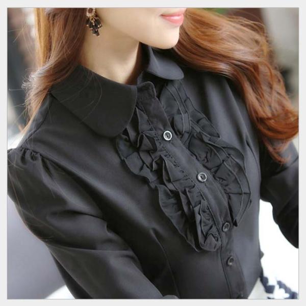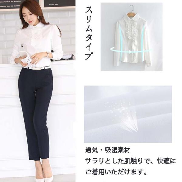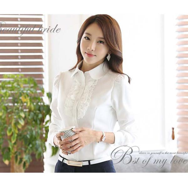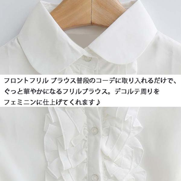 レディース ブラウス シャツ フリル 長袖 トップス ホワイト 白 ブラック 黒 ビジネス 仕事 無地 行事 参観日 オフィス フェミニン 華やか