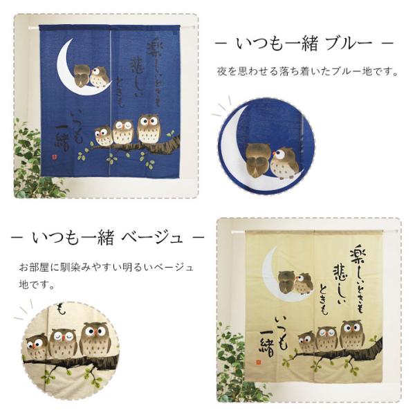 のれん いつも一緒 幅85×丈90cm ブルー/ベージュ 日本製 ふくろう 福来 縁起 フクロウ 不苦労 縁起物 おしゃれ
