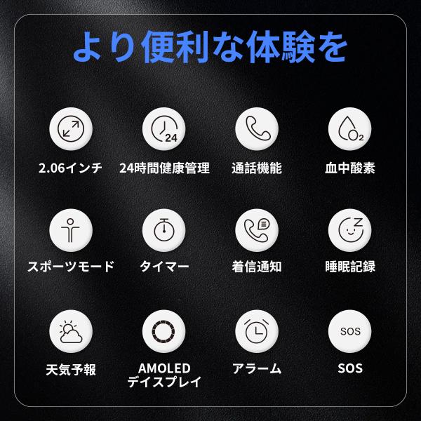 スマートウォッチ 通話機能 2.01インチ大画面 血中酸素 心拍数 着信通知 女性生理健康管理 睡眠検測 歩数計 音楽再生 IP68防水 腕上げ点灯 替えバンド2本付き