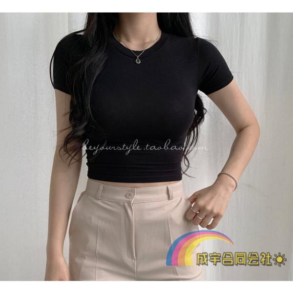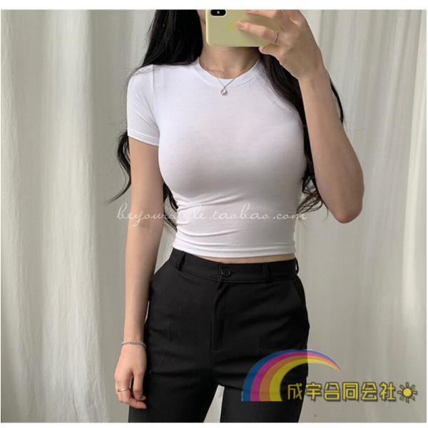 ★6COLOR★カジュアル シンプル ティーシャツ クルーネック カシュクール Tシャツ レディース 半袖 プルオーバー タイトTシャツ ヘソ出しトップス 無地