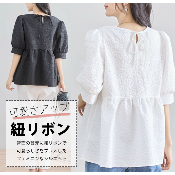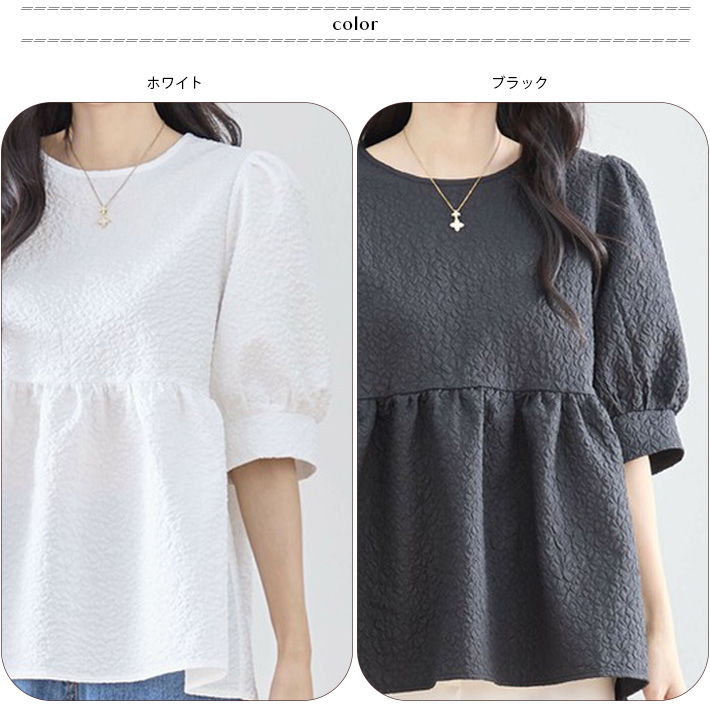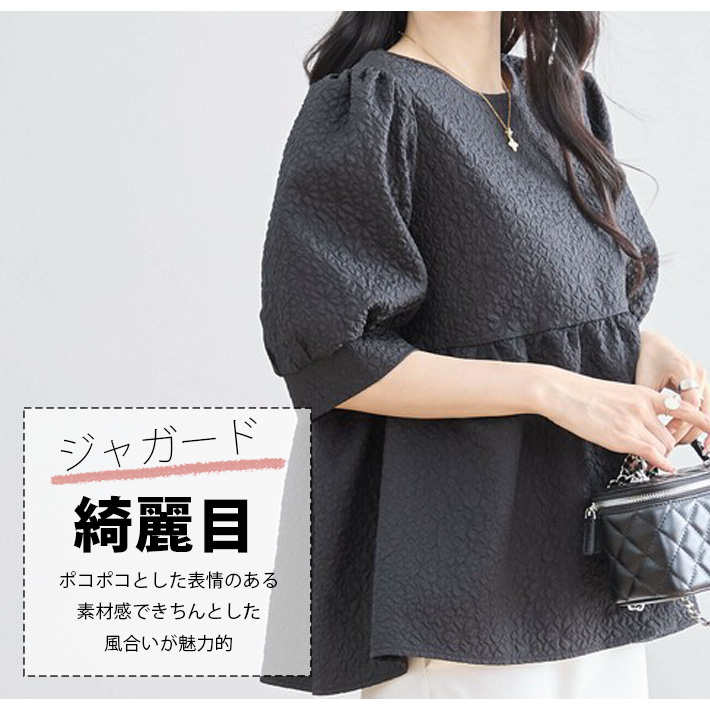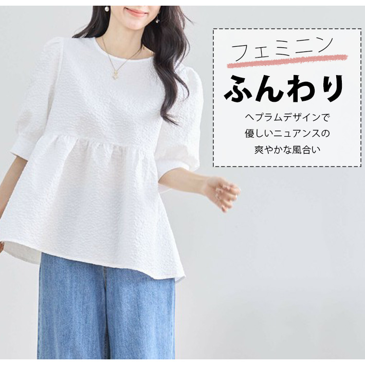 Aライン チュニック ブラウス シャツ ペプラム フレア 五分袖 ボリューム袖 ふんわり フェミニン かわいい ゆったり 大きいサイズ 薄手 無地 春 夏 レディース