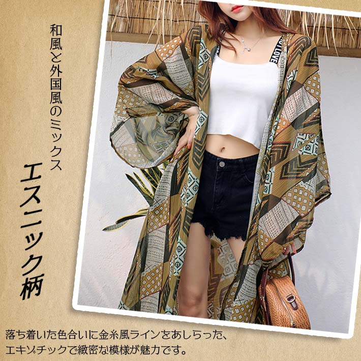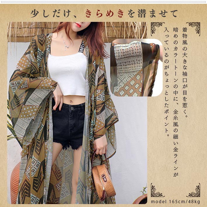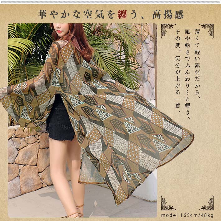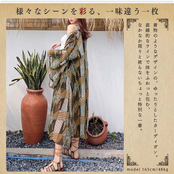 ロング カーディガン サマー マキシ シースルー ロング丈 涼しい 薄手 シフォン 着物スリーブ ゆったり 長袖 エスニック柄 リゾート 海水浴 夏 夏用 レディース