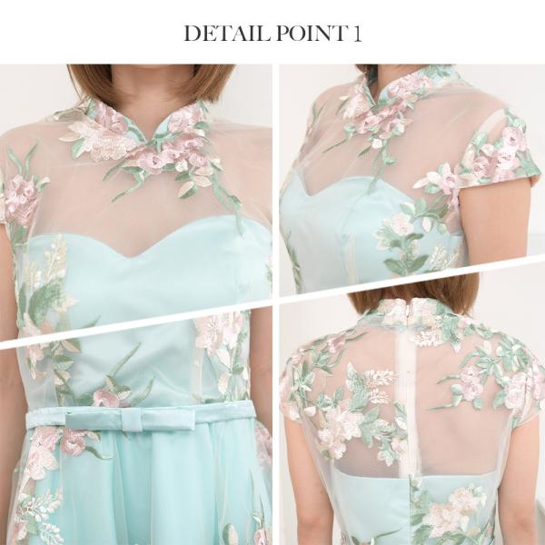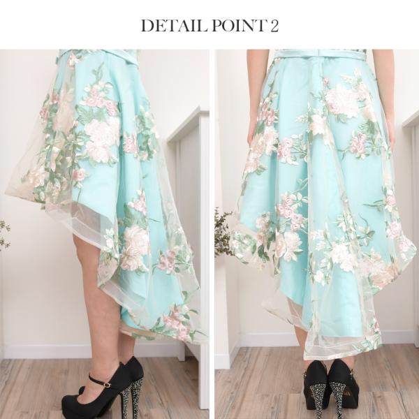 花柄の刺繍が入ったシースルーにアシンメトリーなスカートが印象的なフレアワンピース。結婚式や二次会、パーティー似もとてもおススメです。