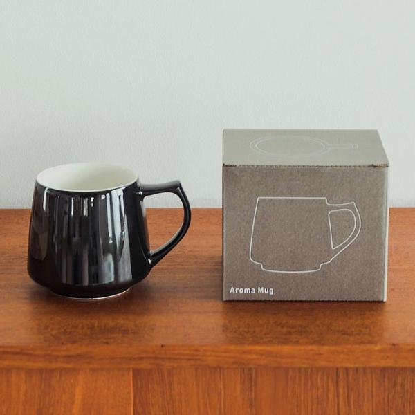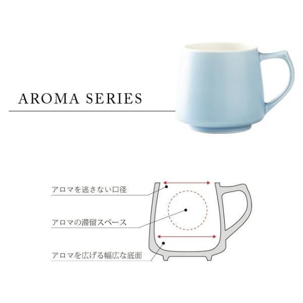 コーヒーの香りを愉しむためのマグカップ「アロマシリーズ」。底に向かって広がり、口元が内側につぼんだ形状が特徴です。この独特の形状が、アロマの滞留スペースと外に逃さない狭い口径を実現しました。