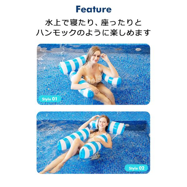 ボートや浮き輪に空気を入れる作業は、とても大変です。でも、このウォーターハンモックは、空気を入れる量がとても少ないので、準備で疲れることなく、スグに海やプールに入ることが出来ます。