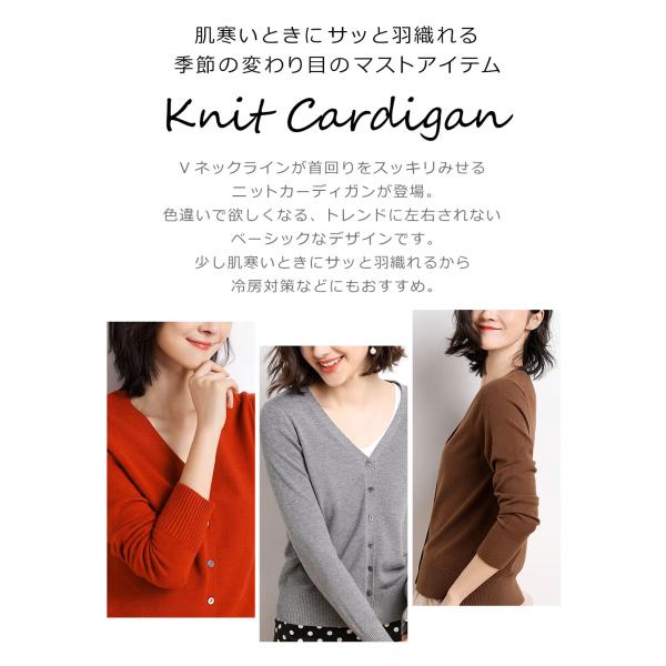 Vネックラインが首周りをスッキリみせるニットカーディガン。色違いで欲しくなる、トレンドに左右されないベーシックデザインのニットカーディガンです。少し肌寒い時にサッと羽織れるから、夏の冷房対策にもオススメのニットカーディガンです。