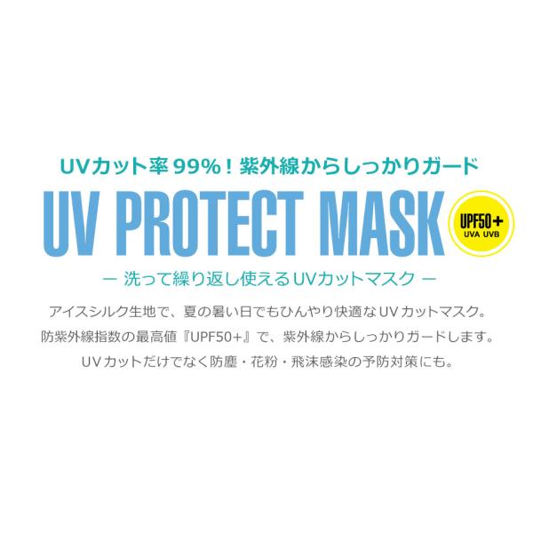 洗って繰り返し使えるUVカットマスク。アイスシルク生地で、夏の暑い日でもひんやり快適なUVカットマスク。防紫外線指数の最高値「UPF50+」のマスクなので、しっかりガードします。UVカットだけでなく、防塵・花粉・飛沫完成ンの予防対策にオススメの洗える布マスクです。