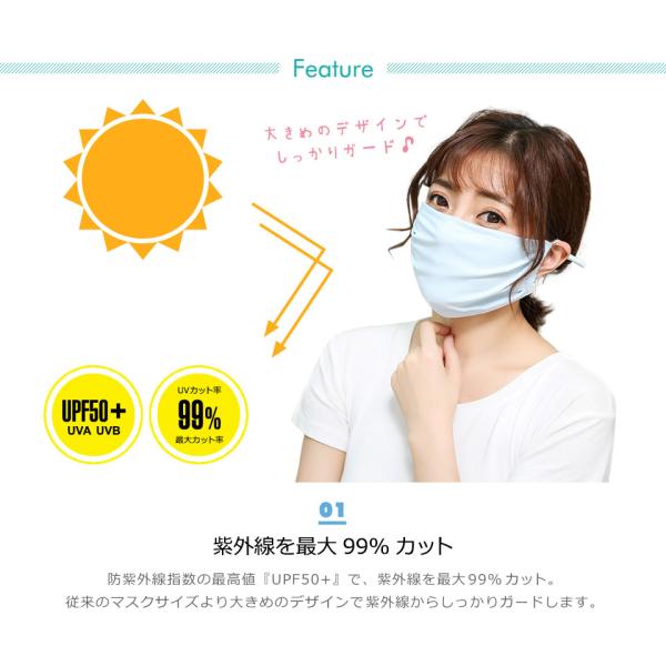 防紫外線指数の最高値「UPF50+」で、紫外線を最大99%カットするマスクです。従来のマスクサイズよりも大きめのデザインで、紫外線からしっかりガードします。
