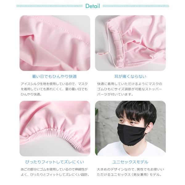 アイスシルク生地を使用しているので、マスクを着用していても蒸れにくく、夏の暑い日でもひんやり快適なマスクです。