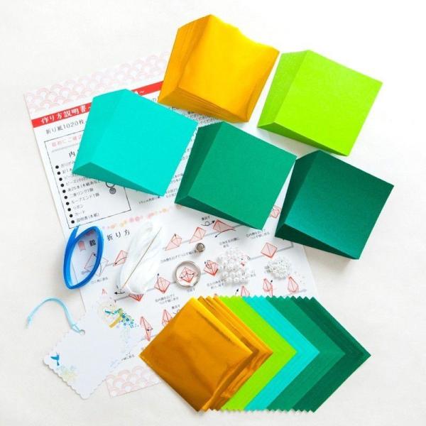 7.5cm角折り紙 緑系5色 1020枚(予備20枚)と糸通しに必要な材料のキットです。