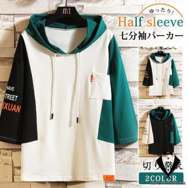 パーカー 七分袖パーカー メンズ 夏パーカー スポーツ 切り替え 半袖 7分袖 おしゃれ フード付きパーカー ルームウェア 夏物