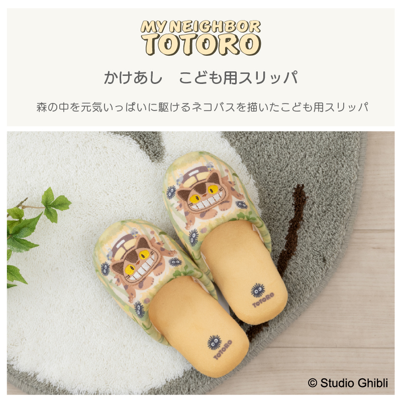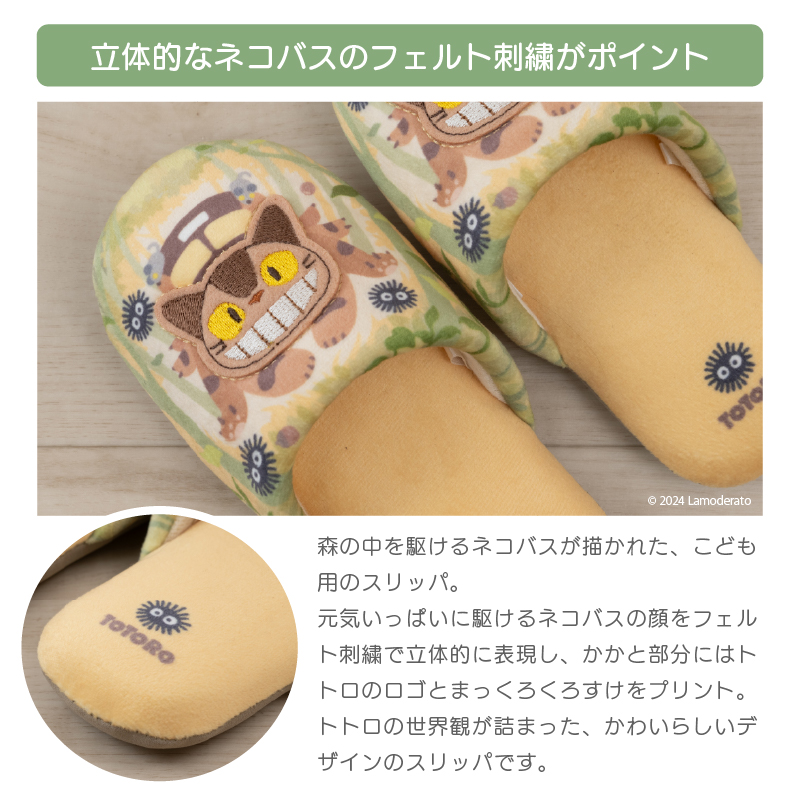森の中を駆けるネコバスの顔が、フェルト刺繍で表現された子供用スリッパです。