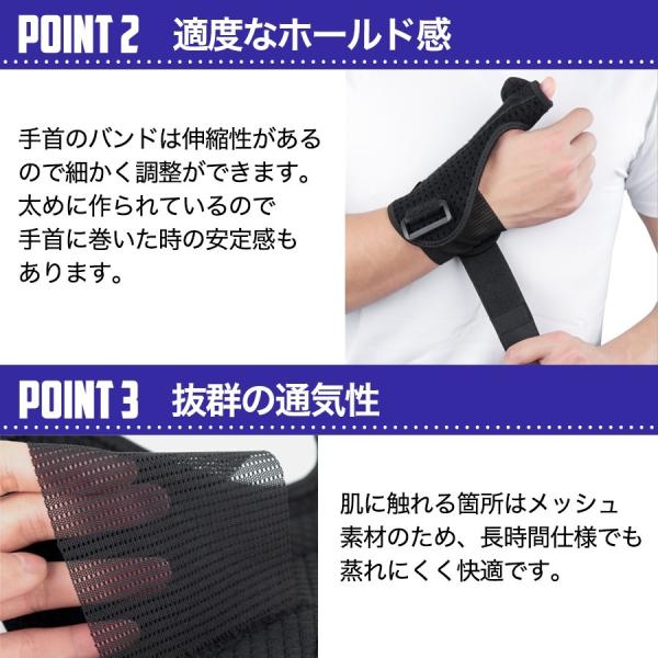 ・手の甲と手のひらの両側にテーピングが編み込まれており、手首の過度な動きを制限しサポートします。