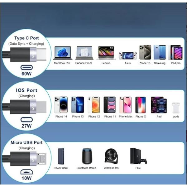 キーワード:USB-C ケーブル PD対応100W/5A QC4.0 超急速充電 USBケーブル 3in1 巻き取り充電ケーブル usb type c ケーブル100W 超急速充電 ライドニング(10W)マイクロusb(10W)マルチ 充電コード MacBook Pro/Air/iPad/Galaxy/phone/Micro 全機種に対応 1.2m 黒 ブラック 白