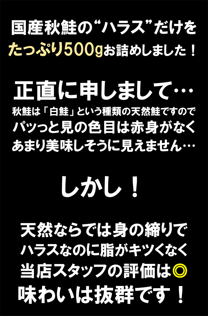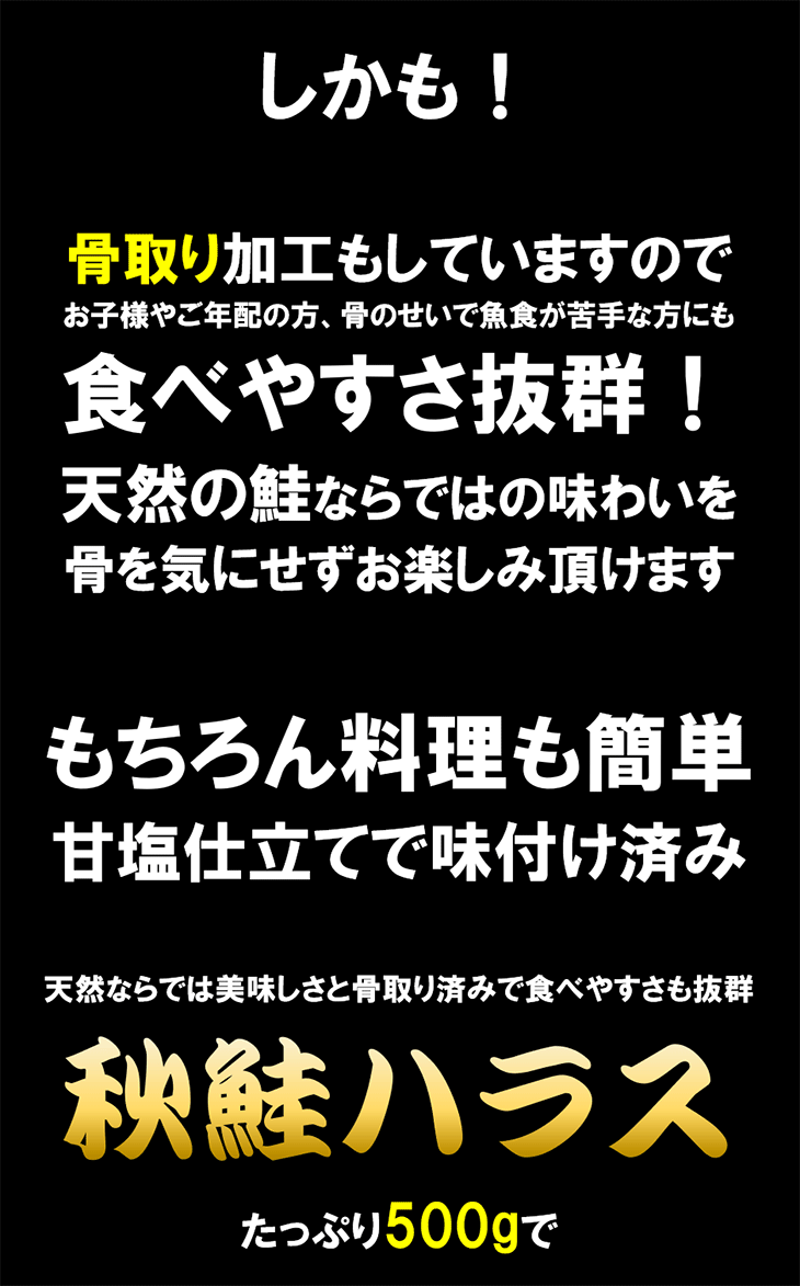【在庫処分特価】骨取り 秋鮭ハラス 500g 海鮮 さけ サケ ギフト 年末年始 朝食 お弁当 おつまみ 爆買