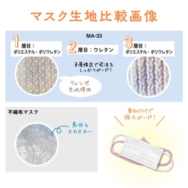 ■全ての製作を日本で、この度はクラボウ様のクレンゼとマスク用素材で三層構造にしており、同じ三層構造素材は他社にございません。表と裏素材に帯電(静電気)防止加工を行う事によりウイルス・花粉・埃が付着し難い効果もございます。