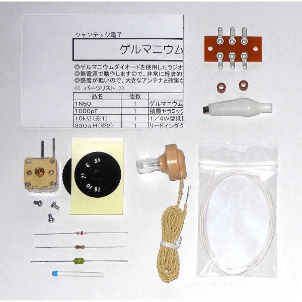 ゲルマニウムラジオを製作する部品をセットにした、ラジオキットです。3Pのラグ板に半田付けで配線します。ゲルマニウムラジオは無電源で動作しますが、電波のエネルギーからイヤホンを鳴らす電力を発生させる必要がありますので、性能の良いアンテナを接続する必要があります。使用場所の電波状況とアンテナの性能で音量が決まります。(送料180円)