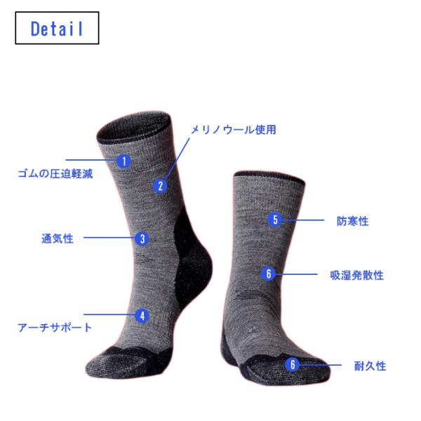 メリノウール×化学繊維使用のメンズトレッキングソックス。