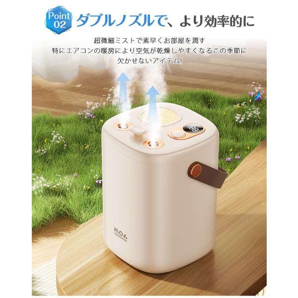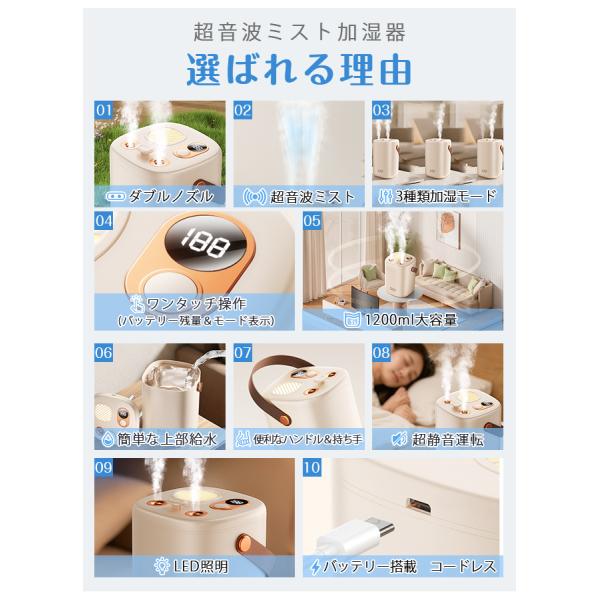 【10%OFFクーポン!】超音波加湿器 ダブルノズル ナノミスト 1.2L大容量 空気清浄 アロマ LEDライト 3種類加湿モード 乾燥 上部給水式 type-c充電式 爆買