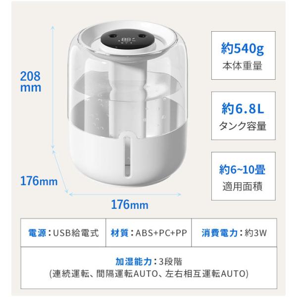 加湿器 大容量 卓上 6.8L デュアル噴霧口 加湿機 湿度表示 3段階 超音波式 省エネ エコ 新生活 オフィス 寝室 静音 おしゃれ 乾燥対策 室内 爆買