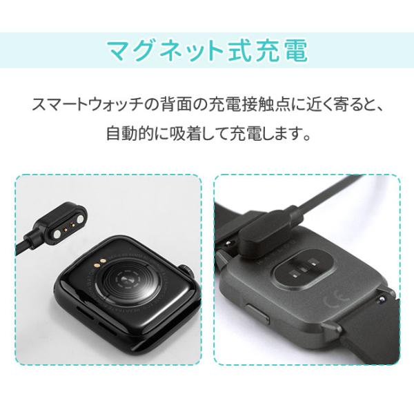 スマートウォッチの背面の充電接触点に近く寄ると、自動的に吸着して充電します。