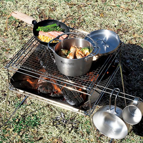 焚火、炙り火にも使用でき、蓋はステンレス3mm厚と重いので、アウトドアの炊き込みや煮込み調理に最適です。</p>