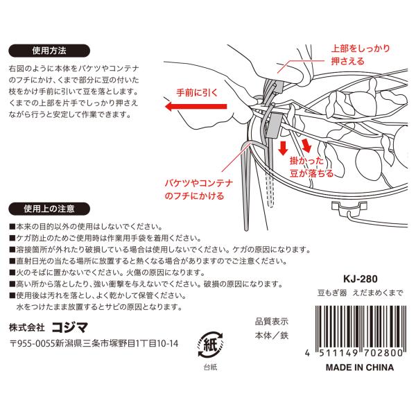 全長約290mm×幅約150mm×高さ約60mm、重量:約380gまめもぎ専用のくまでです。バケツやコンテナのフチにかけ、くまで部分に豆の付いた枝をかけ、手前に引いて豆を落とします。材質:鉄、製造国:中国
