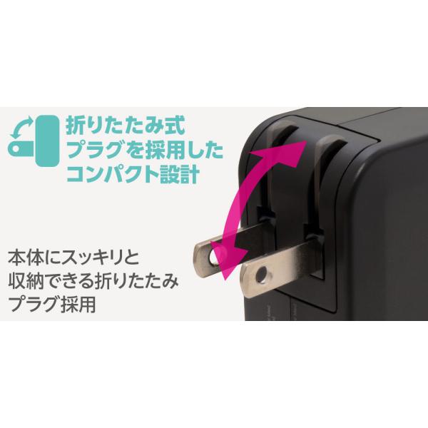 本体にスッキリと収納できる折りたたみプラグ採用。コンパクトになり、バッグのなかでかさばらず収納できて持ち運びに便利です。