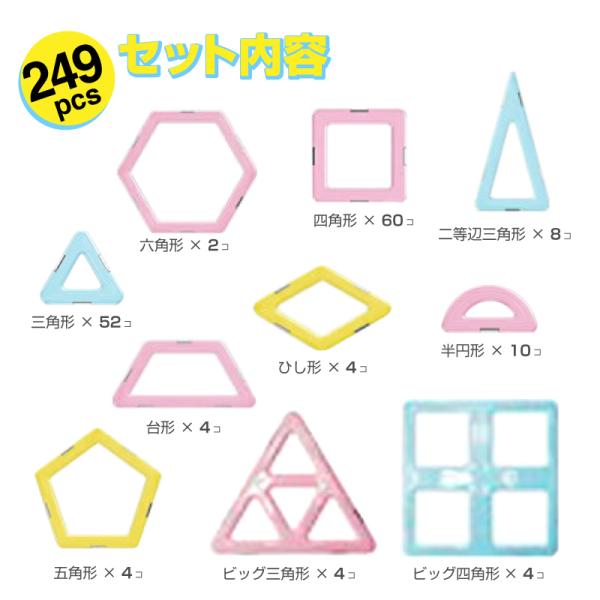 ・こちらは新タイプのパステルカラー237個セットにお城パーツを1色追加した249個セット!基本パーツやタイヤパーツがすべて揃っており、初めての方でも大満足で遊べます!