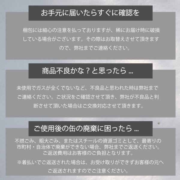 未使用でガスが出ないなど、不良品と思われた時は弊社にご連絡ください。大至急代替品を発送させていただきます。