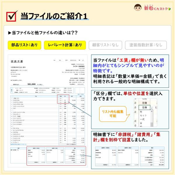 A07-c2 請求書ファイル(レバレート計算・顧客リスト・部品リスト)自動車 修理 整備 エクセル 新田くんソフト