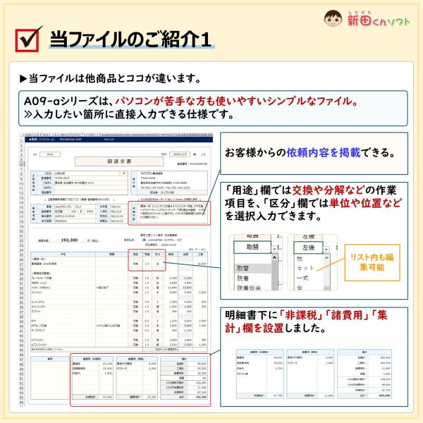A09-a2 請求書ファイル・シンプルタイプ(依頼内容掲載)整備 板金 点検 エクセル 新田くんソフト