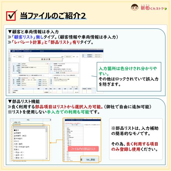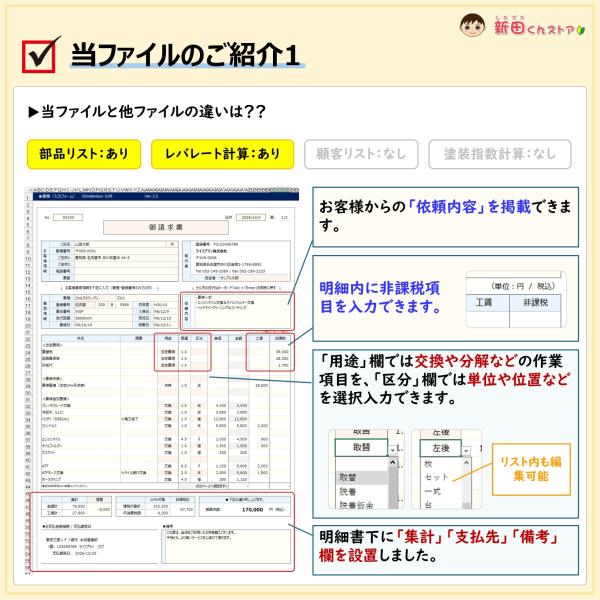 A09-b1 請求書ファイル(レバレート計算・部品リスト・依頼内容掲載)自動車業務 Excel 新田くんソフト
