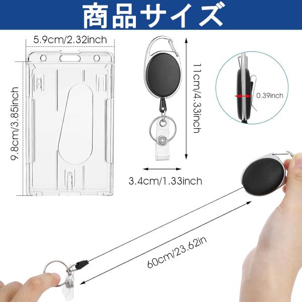商品仕様パッケージには縦型透明プラスチックバッジホルダー2個とバッジリール2個が含まれます。 IDホルダーは2.1 x 3.5インチで、ほとんどのクレジットカードサイズの標準カードに適しています。