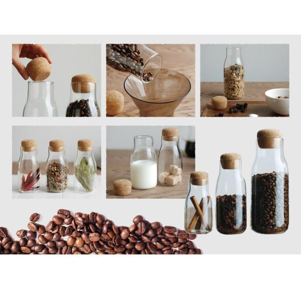 耐熱ガラスとコルクを組み合わせたボトル型キャニスター。600mlにはコーヒー豆やグラノーラ、300mlには茶葉やナッツ、150mlにはスパイスや ハーブを入れるのにちょうど良いサイズ。