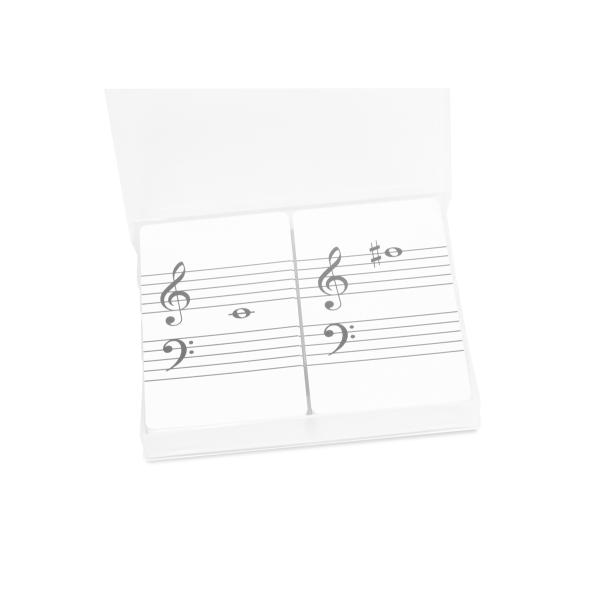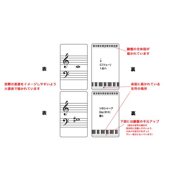 【概要】音符を素早く読めるようにするためのフラッシュカードです。表面には大譜表のト音記号とヘ音記号と音符が1つ描かれており、その音は鍵盤上のどこの音なのかを裏面を見て確かめます。裏面には鍵盤の図と黒点(音符の場所)が描かれており、表面の音符が鍵盤上のどこの音なのかが分かります。音の高さもオクターブを間違えないよう、中央のド(1点ド)だけをグレー表示にしてあり、今の音符が鍵盤全体のどのあたりなのかを相対的に理解できるようになっています。まず少量のカードから始め、徐々に足していき、覚えていくことによって音符が読めるようになります。