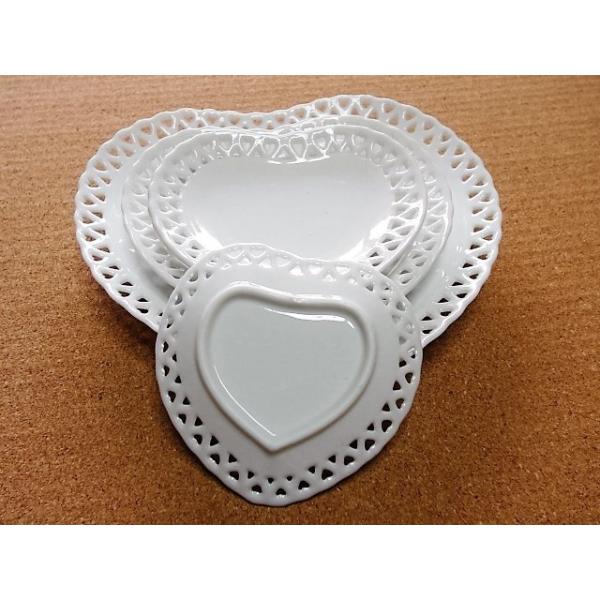 大人気!周りに透かしが入ったとっても可愛いハート型の中皿になります。<br>真っ白なプレートはどんなお料理も引き立ててくれます。<br>サイズが4種類あります。<br>S 10cm<br>M 12cm<br>L 15cm<br>LL 20cm<br>こちらはSサイズになります。