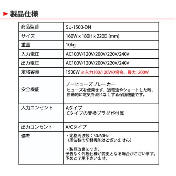 SU-1500-DN 海外 日本国内用 1500W 変圧器 | 正規代理店 入出力 100V 120V 200V 220V 240V